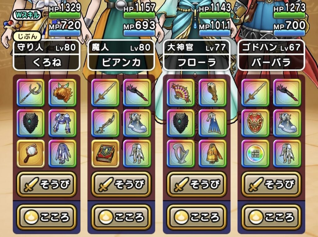 2026年1月1日より追加された新しいほこら、さまようロトのよろい。なかなかお強い敵さんが登場しました。わたしの気持ち的にオートで倒したい!!!ので、手持ちの装備で一旦パーティ組んでみたのがこんな感じです。
