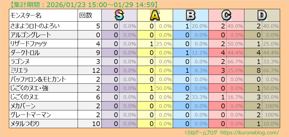 S~Aの数字とパーセンテージ:各ドロップ数と、討伐回数に対数割合 (モンスター名ごとに集計)
