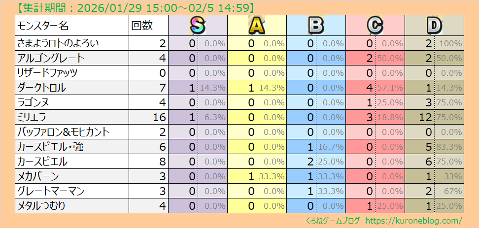 S~Aの数字とパーセンテージ:各ドロップ数と、討伐回数に対数割合 (モンスター名ごとに集計)